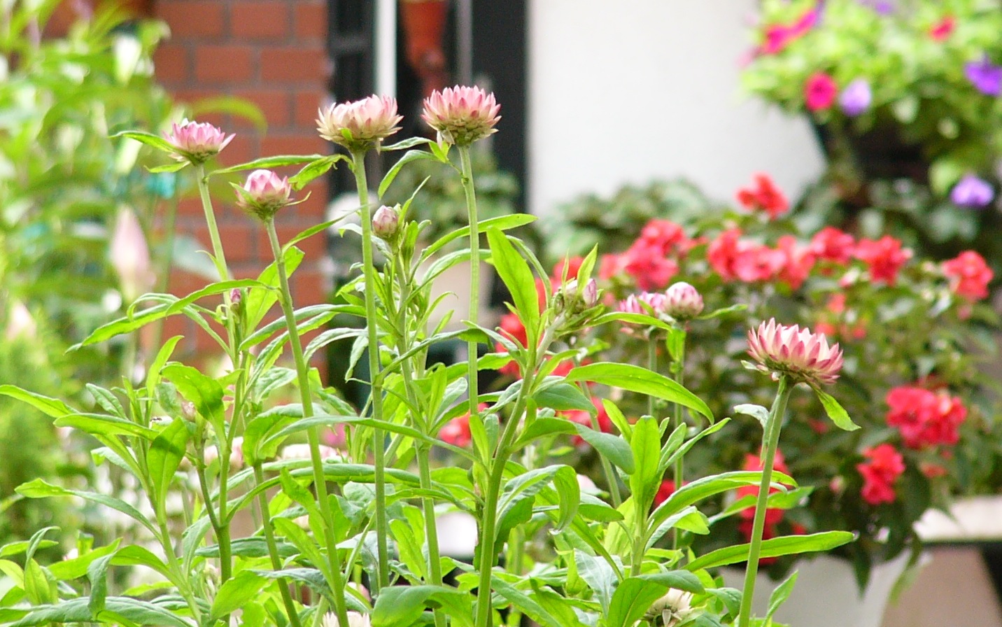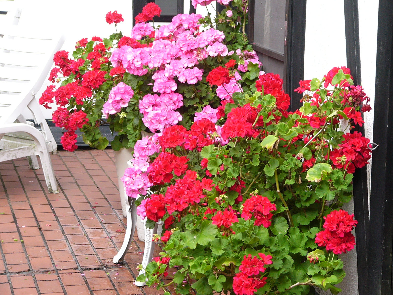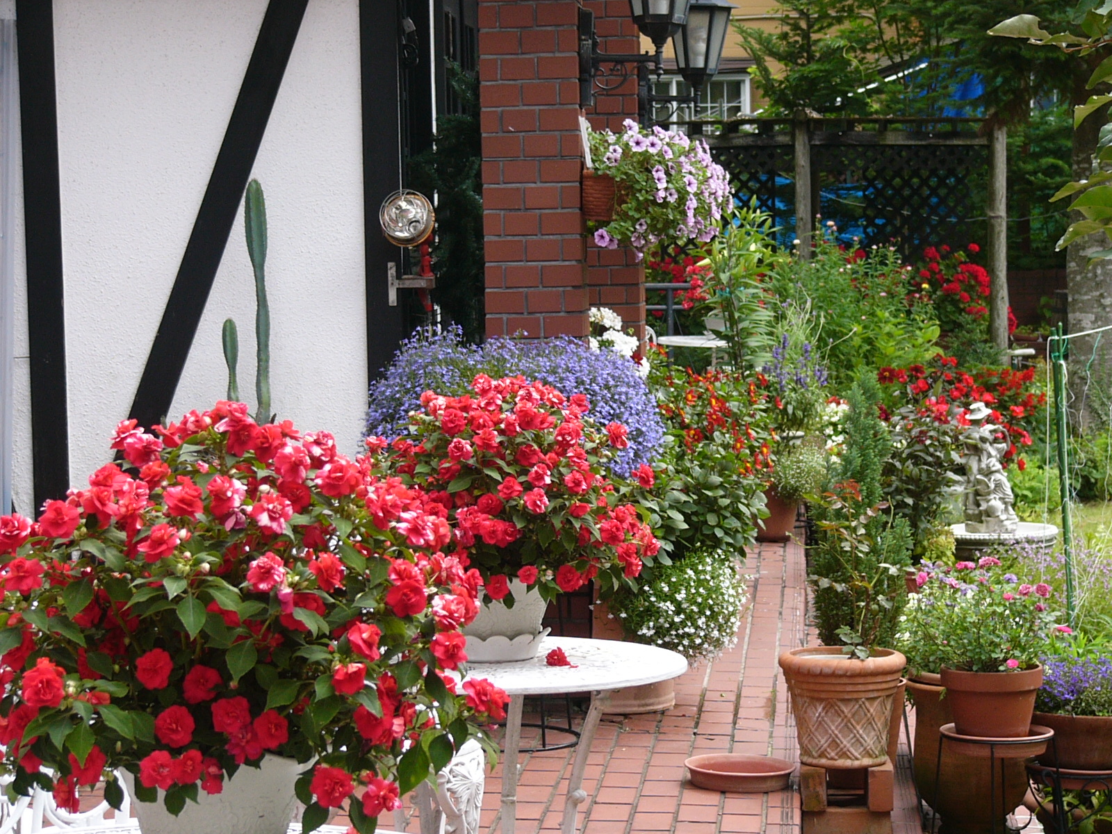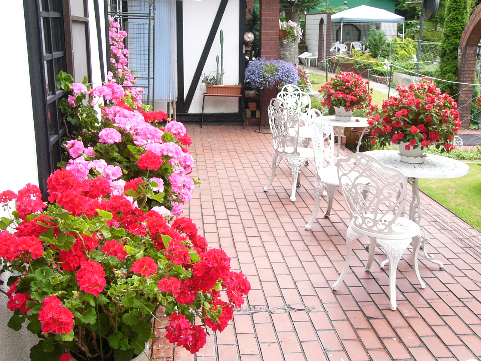 ソルボンヌ(ゆり) 左-八重インパチェンス 奥-ゼラニウム